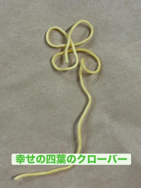 昨年の8月に『幸せの扇』と『幸せのリボン』をご紹介させていただきました。麺の加工中に出来る派生するものの事なのですが、今回は何と『幸せの四葉のクローバー』でした。とにかく見つけた社長と部長が驚愕して喜んで騒いでいた光景がとても可愛らしくてですね〜。なんかとても嬉しい気持ちになりましたね。